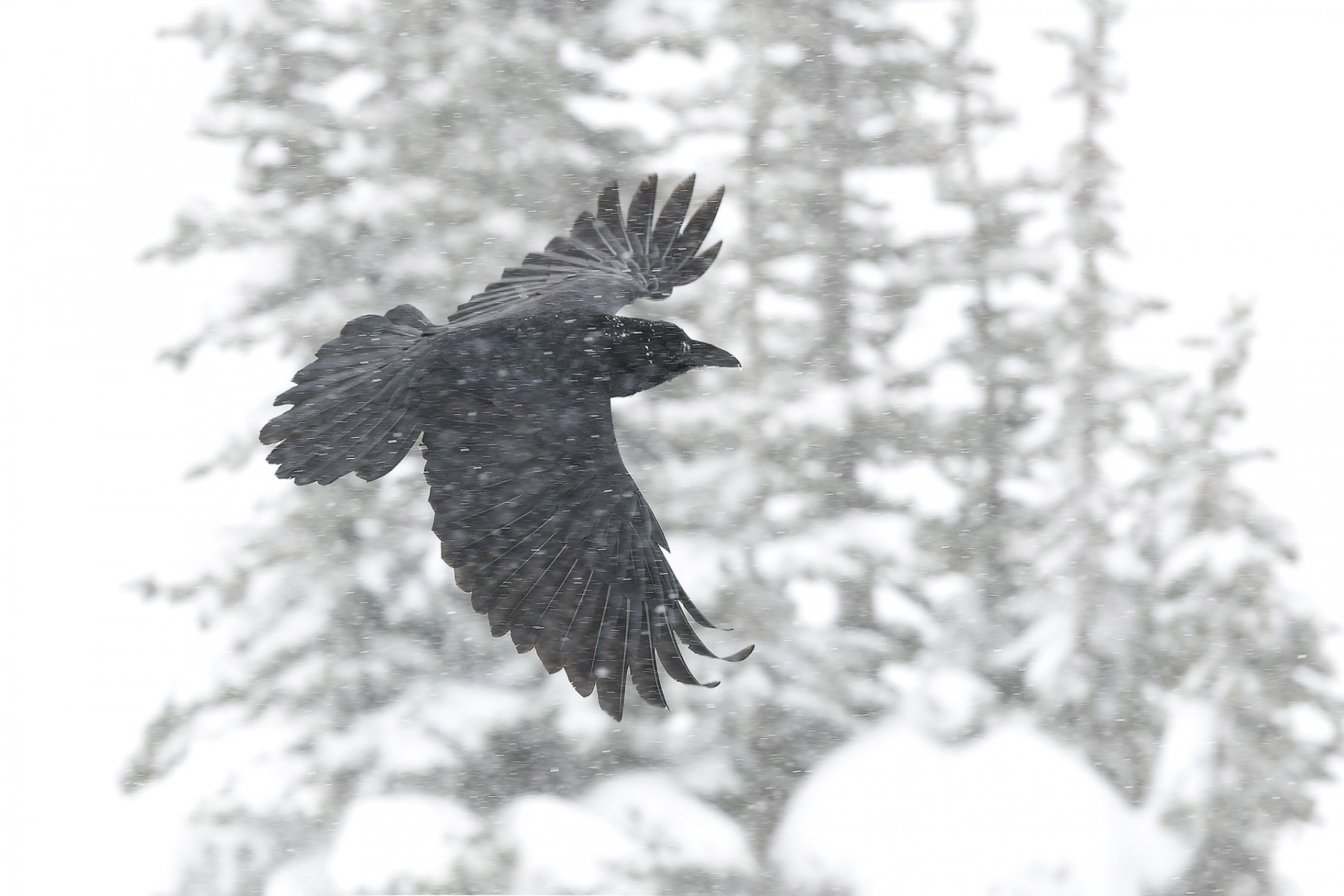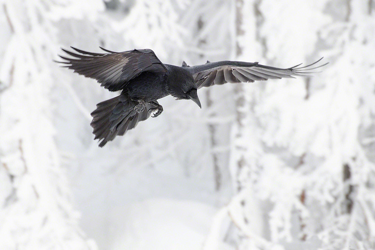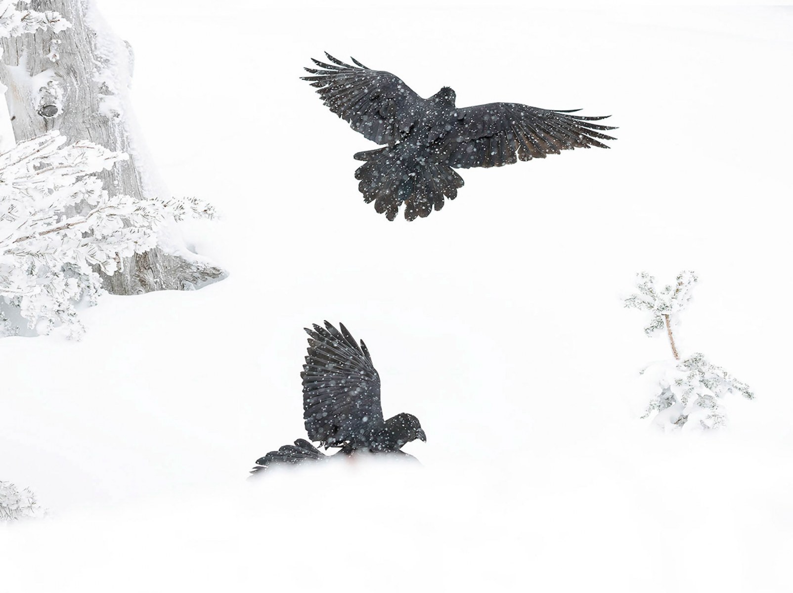 Raven’s journey has been interwoven with humanity since the dawn of recorded time, embodied in art, myth and literature throughout the ages. Figures identifiable as Ravens or Crows appear in the Lascaux caves in Southern France, dating back 17,000 years. My journey photographing of Ravens began from the comfort of a warm car, and a thermos of hot cocoa. I watched a group of Ravens off in the distance, gliding effortlessly between towering fir trees. Not a care in the world. I had never taken any Raven photographs before, and was about to leave for home. But something . . . something about those Ravens called to me. Did I decide to come to them? Or did they decide to have me come over? I’m still not sure.