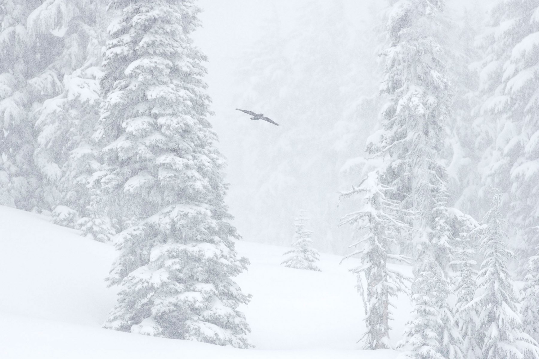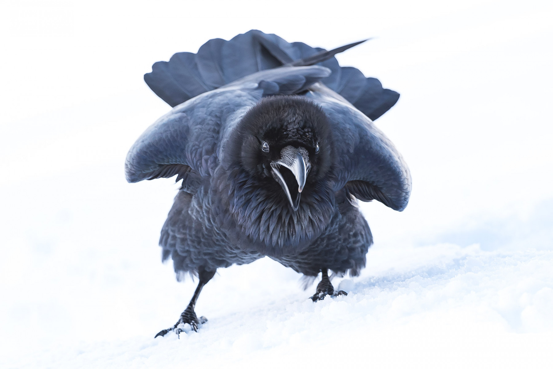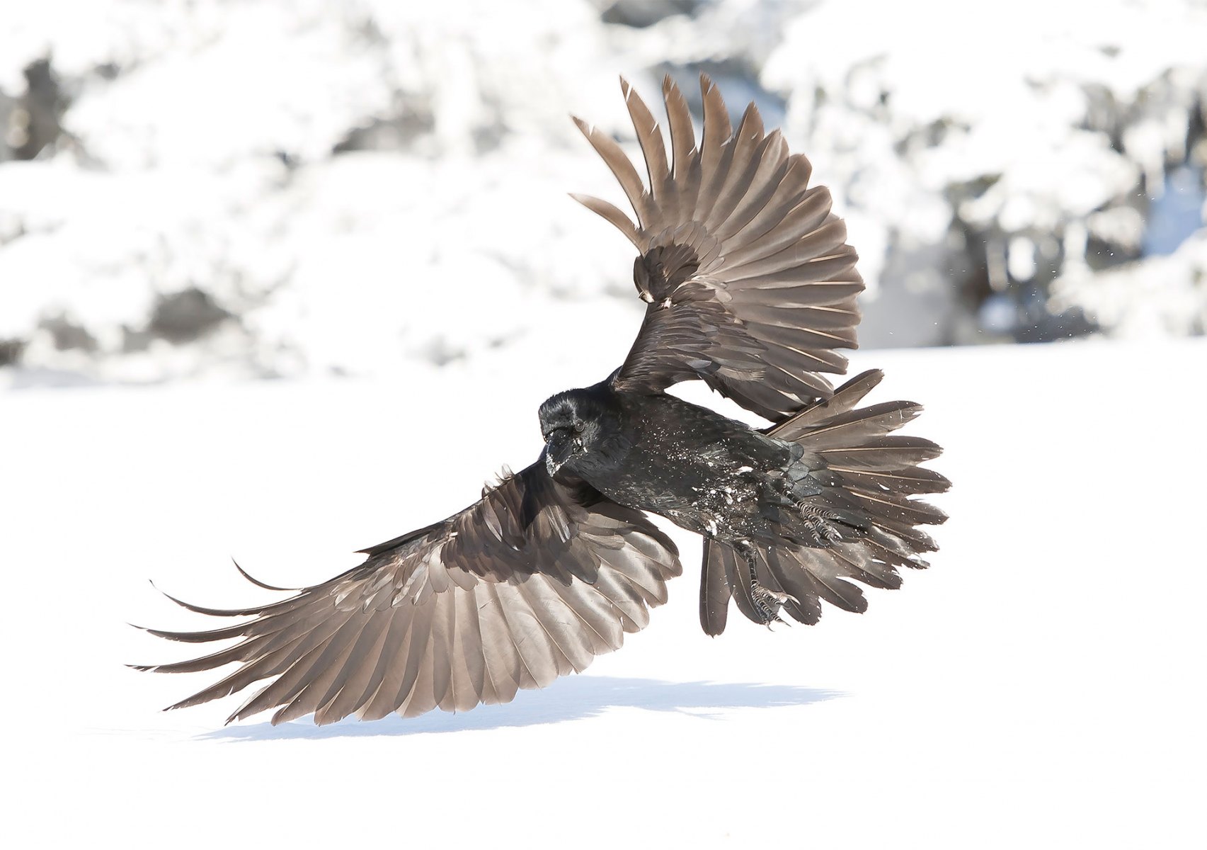 Raven’s journey has been interwoven with humanity since the dawn of recorded time, embodied in art, myth and literature throughout the ages. Figures identifiable as Ravens or Crows appear in the Lascaux caves in Southern France, dating back 17,000 years. My journey photographing of Ravens began from the comfort of a warm car, and a thermos of hot cocoa. I watched a group of Ravens off in the distance, gliding effortlessly between towering fir trees. Not a care in the world. I had never taken any Raven photographs before, and was about to leave for home. But something . . . something about those Ravens called to me. Did I decide to come to them? Or did they decide to have me come over? I’m still not sure.